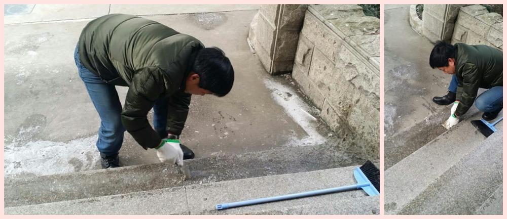 為了防止極端嚴(yán)寒天氣水管爆裂,育才服務(wù)中心畢經(jīng)理親自帶頭落實(shí)預(yù)案,1月19日他布置工程人員首先停消防泵泄壓,20日排空屋面消防水管和生活水管(這一方案早在2015年初畢經(jīng)理就有這一想法,原因就是屋面消防水系統(tǒng)管網(wǎng)和生活水管網(wǎng)均未采取任何保暖措施)…….1月22日晚嘉定下起了小雪,堅(jiān)守在崗位上的畢經(jīng)理打著手電筒巡視著校園的各處要道出入口;23日上午為防止上下臺(tái)階的同學(xué)摔倒,他自己拿著小鏟子在鏟臺(tái)階上冰,他的這一舉動(dòng)被學(xué)校老師偷偷的拍成小視頻,曬在網(wǎng)上……自1月21日起,畢經(jīng)理就入住學(xué)校,關(guān)注寒潮預(yù)警信息的發(fā)布,他實(shí)時(shí)關(guān)注天氣預(yù)報(bào),24小時(shí)駐扎在學(xué)校,隨時(shí)關(guān)注校園各處的水管等易發(fā)生災(zāi)情的地方,晚上就在辦公室的沙發(fā)上稍作休息。