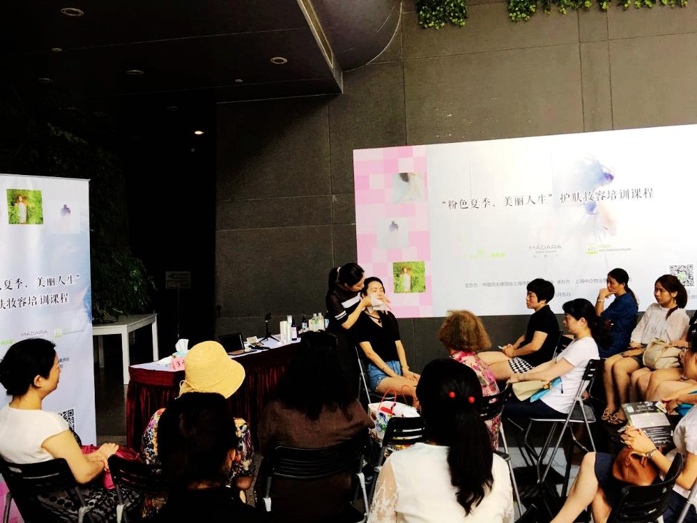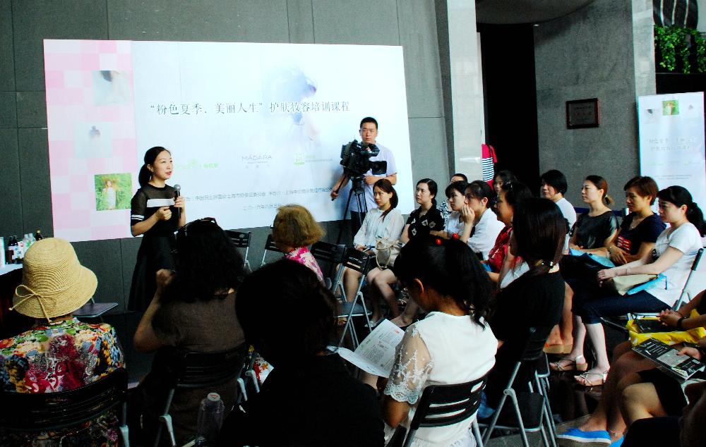 8月5日中午,中企物業(yè)和靜安區(qū)民主建國委員會在靜安中華大廈大堂共同舉辦了一場 “粉色夏季,美麗人生” 主題活動,特邀化妝行業(yè)資深美容顧問孟琳琳老師為樓宇白領講授了一堂專業(yè)護膚美容培訓課。