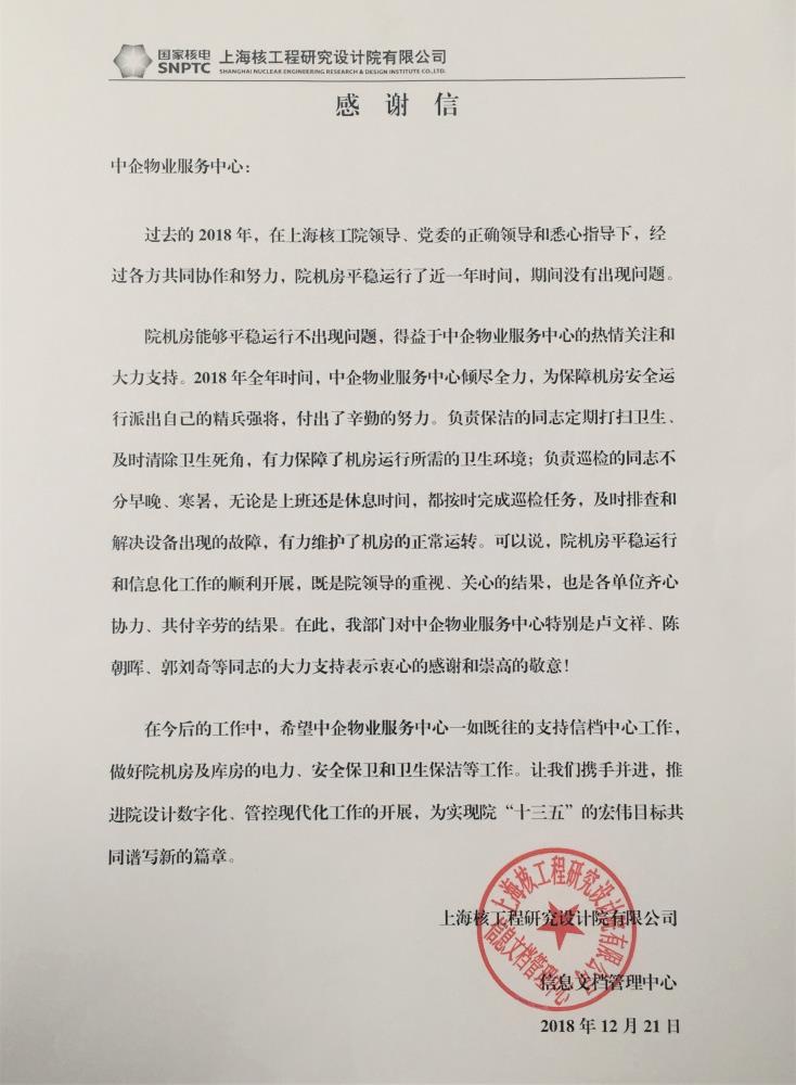 臨近年末,中企物業(yè)陸續(xù)收到許多感謝信,有對(duì)員工個(gè)人的贊賞,也有對(duì)項(xiàng)目團(tuán)隊(duì)的感謝。今天我們收到一封來自核工院的感謝信,這位和中企已經(jīng)合作多年的老伙伴,每年都一定會(huì)收到來自他們的感謝,這種始終如一的精神讓我們感受到業(yè)主的支持和信任。我們最貼心的服務(wù)與客戶真摯的習(xí)慣,正是中企物業(yè)實(shí)力的最佳證明。