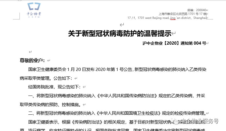 如您公司內(nèi)部出現(xiàn)此次傳染病明顯癥狀,請立即告知物業(yè)服務(wù)中心同時通知區(qū)疾病預(yù)防控制中心。